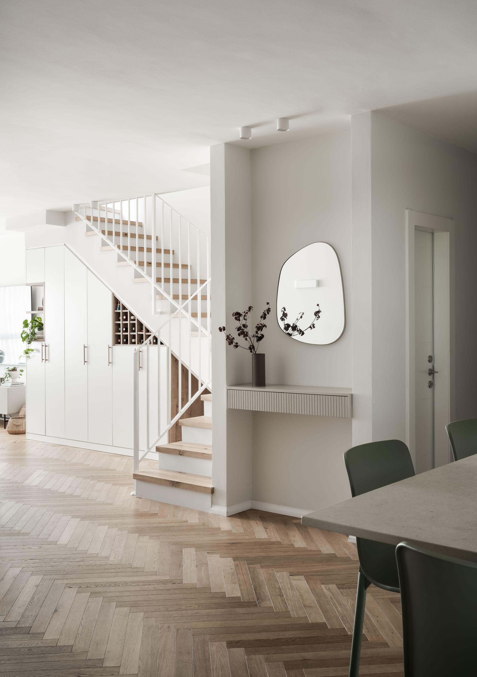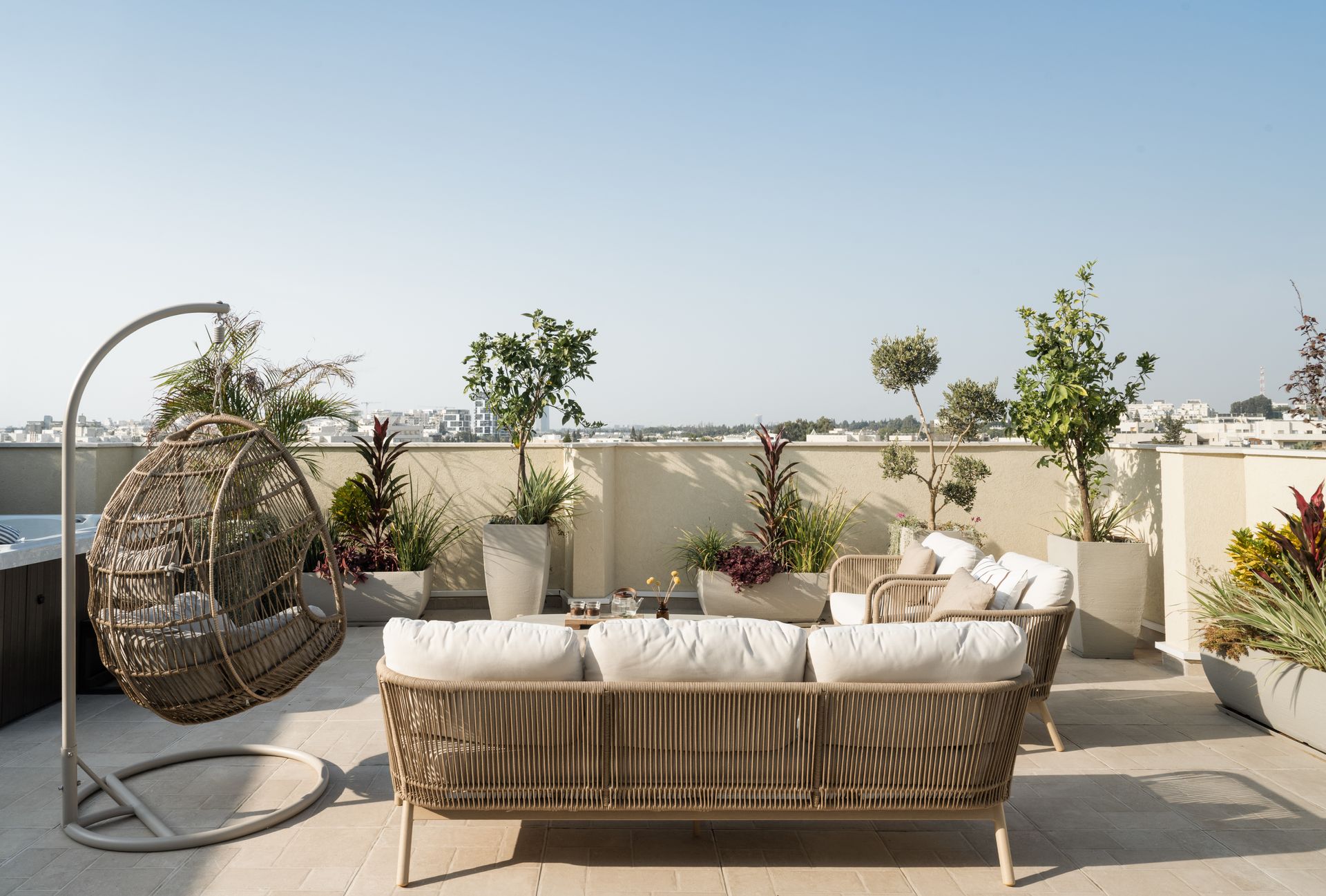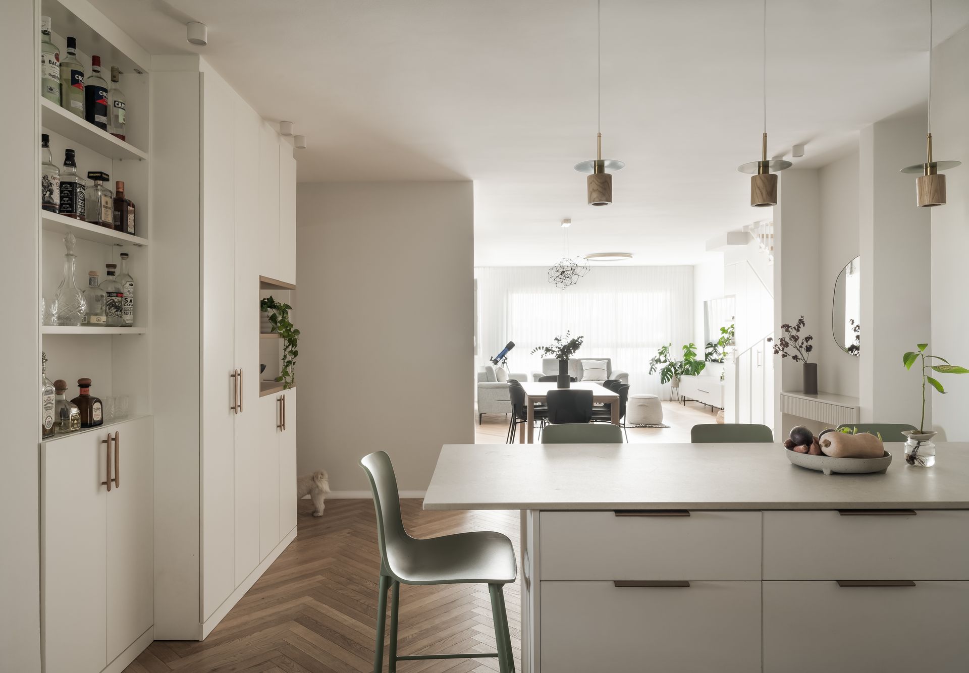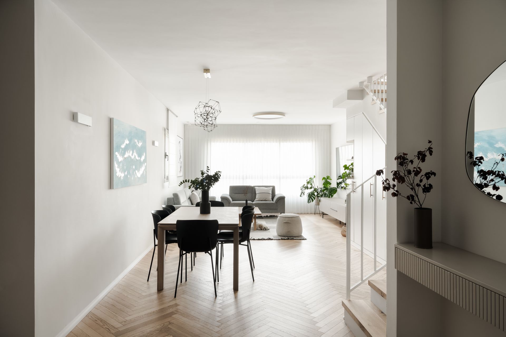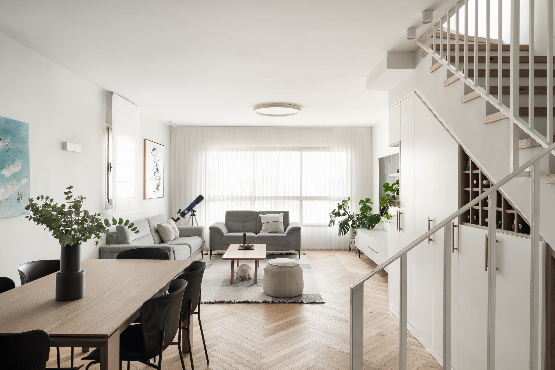 פנטהאוז דו-מפלסי בן 50 שנה בצפון תל אביב עבר שיפוץ מקיף עבור משפחה בת ארבע נפשות. המטרה: להפוך את הדירה לבית שמשרת את המשפחה היום וגם לשנים קדימה, תוך מימוש הפנטזיה של בית פרטי בתל אביב. השפה העיצובית נשענת על צבעים בהירים, חומרים טבעיים ונגרות מותאמת אישית שממשיכה את קווי המבנה.